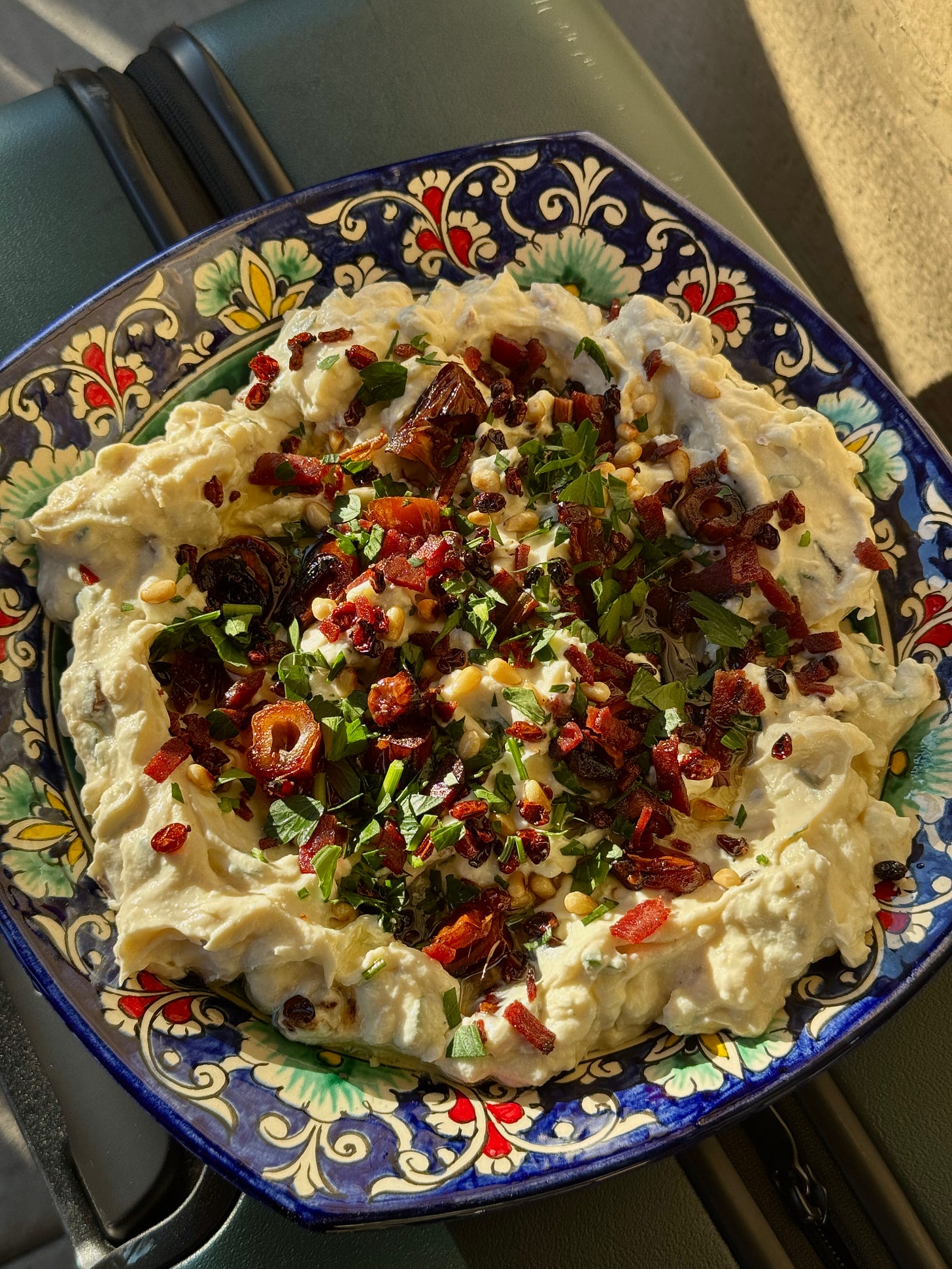 Top generously: Scatter the remaining bacon, dates, zereshk, pine nuts, candied pecans, and fresh herbs over the top. Make it look abundant and chaotic in the best way.